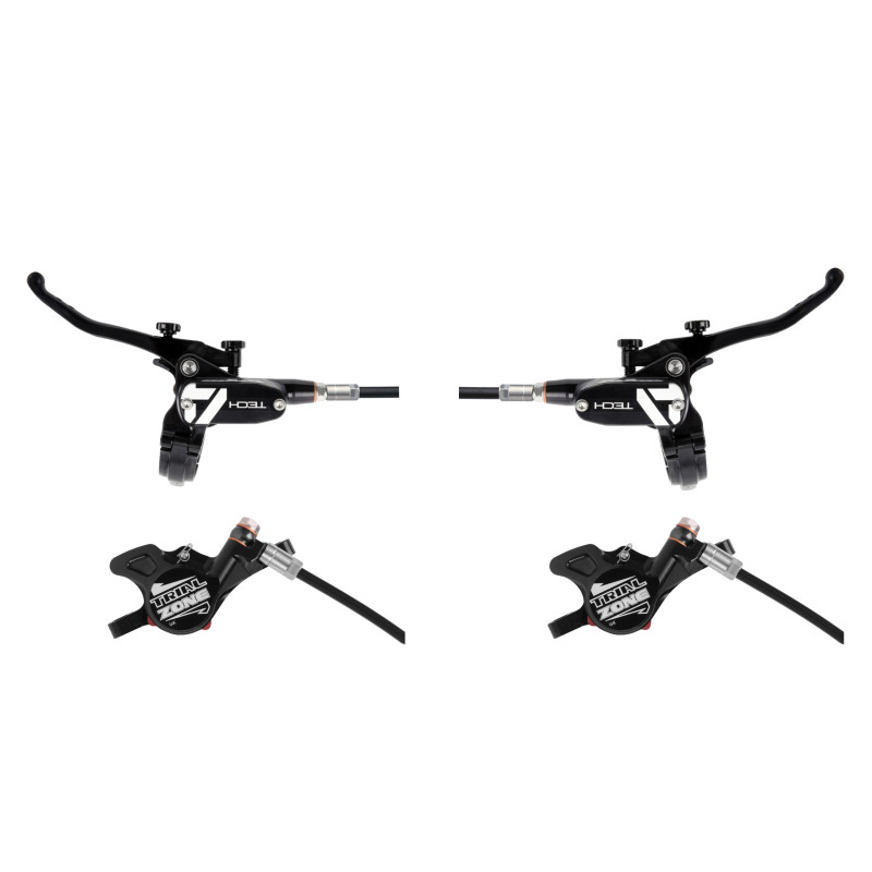 Complete set of HOPE Tech 4 Trial Zone brakes. This Tech 4 brake lever offers a 30% increase in power over the previous Tech 3 model - which really shows in the resulting braking performance! The Tech 4 system uses an all new internal seal to reduce friction and the pivot connecting the brake body and lever pivots on roller bearings, allowing for reduced friction as well as end lever wobble. The reduced lever wobble, in turn, provides a lighter lever action, which reduces fatigue on the rider's fingers and hand and maintains the legendary feeling of power and modulation for which HOPE is known among riders. The new riveted sleeve increases safety, reduces weight and overall height!